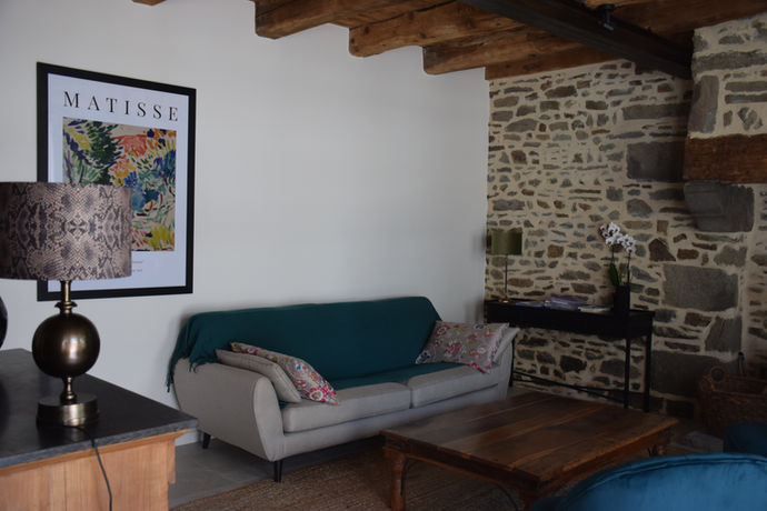 Intérieur chaleureux et chic: Poutres apparentes, parquets anciens d'origine, poêle à bois, cuisine entièrement équipée, grande table en bois pour des repas en toute convivialité.