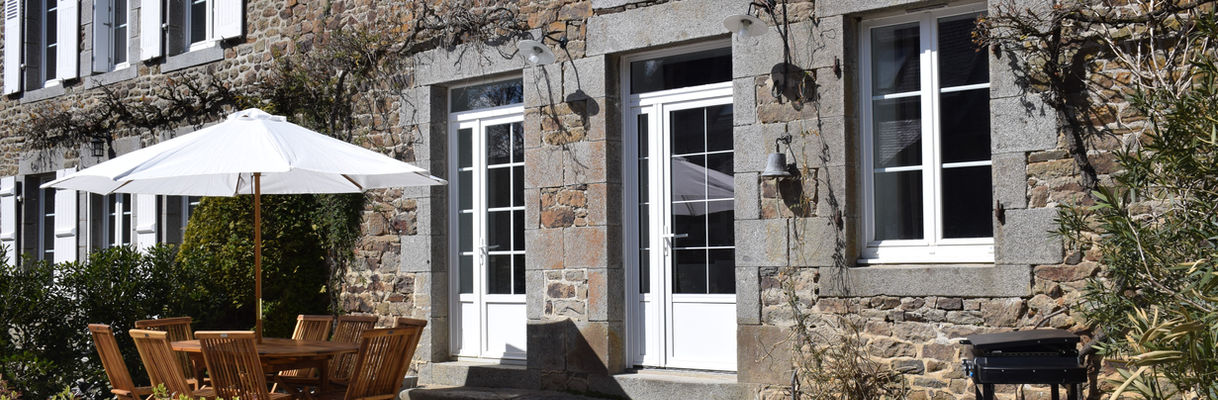 - Terrasse plein sud avec plancha, table à manger, chaises extérieures et parasol.